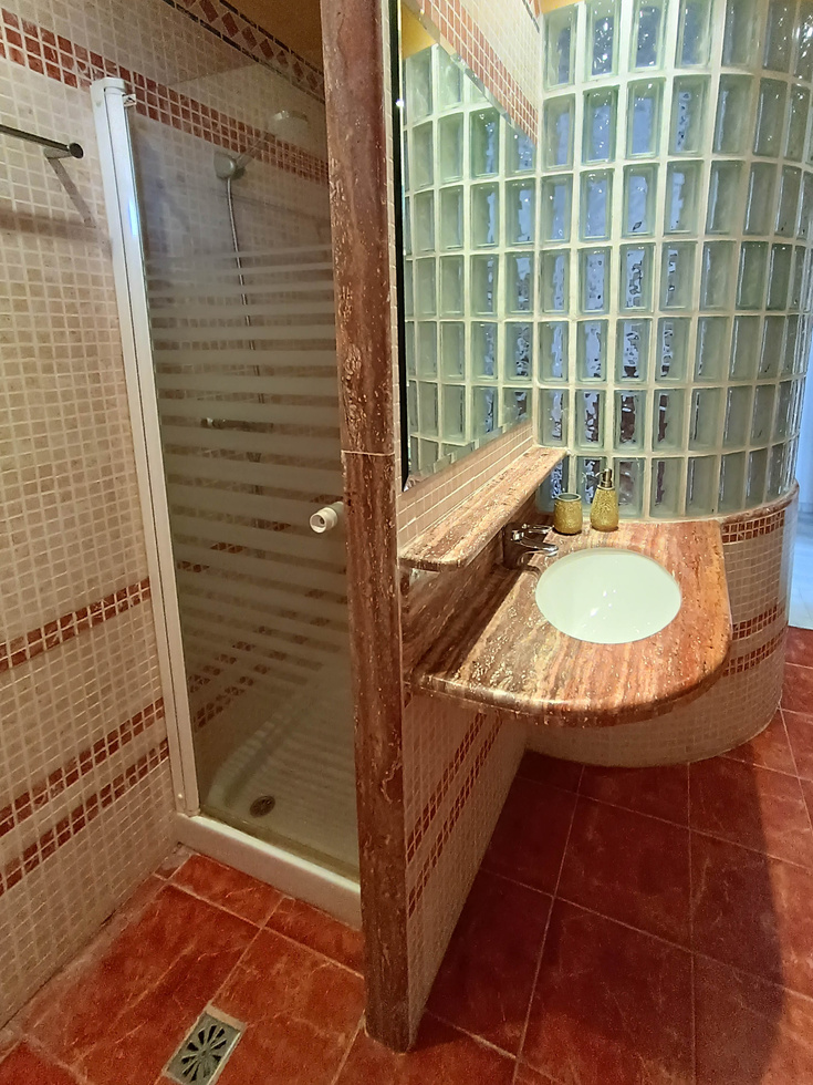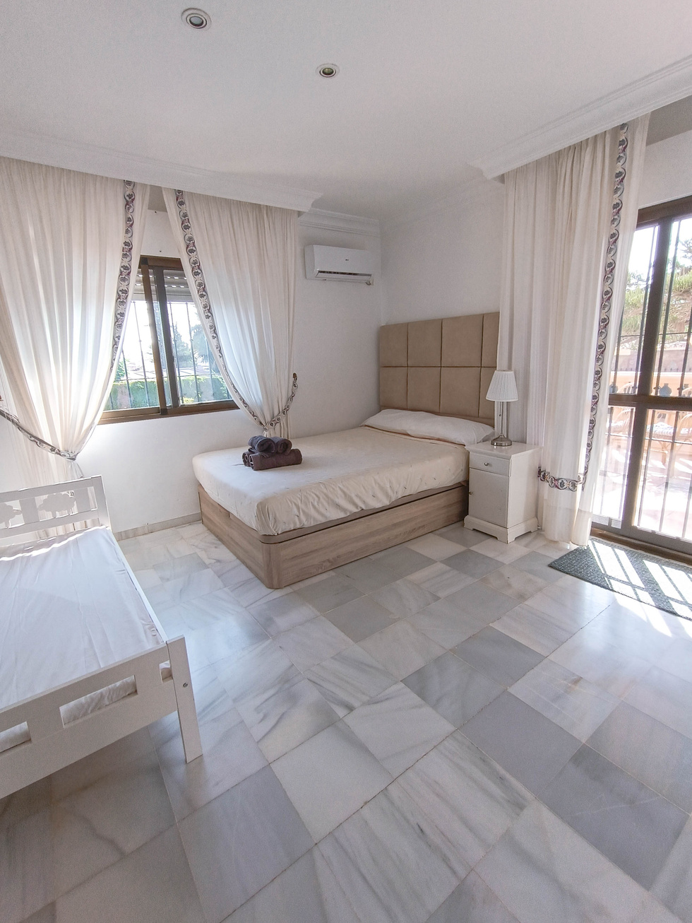 La casa consta de cinco espaciosas habitaciones con aire acondicionado y alguna de ellas con salida a un balcón y vistas a la piscina . 2 baños, completos, toallas y ropa de cama .